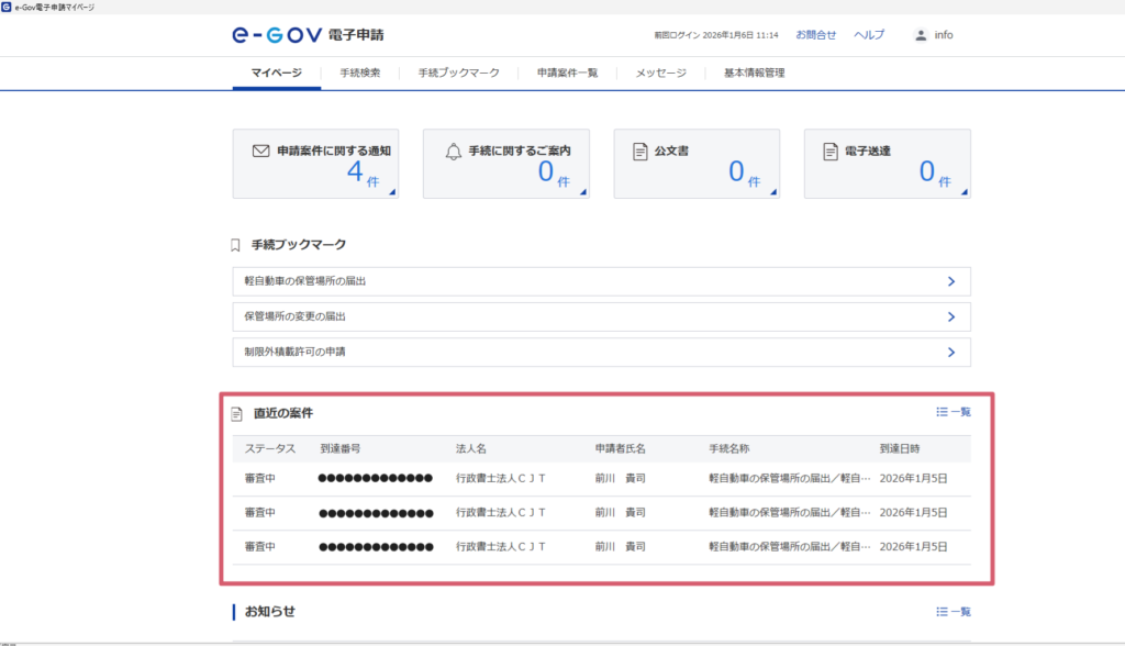 - 進捗情報や手続き終了を確認する通知に、到達番号や受理番号と、届出の内容(自動車の使用者や車台番号等の情報)とがまとめて表示されないため、大量に申請している場合、どの依頼者の申請であるか一目で確認することができないのが不便です。