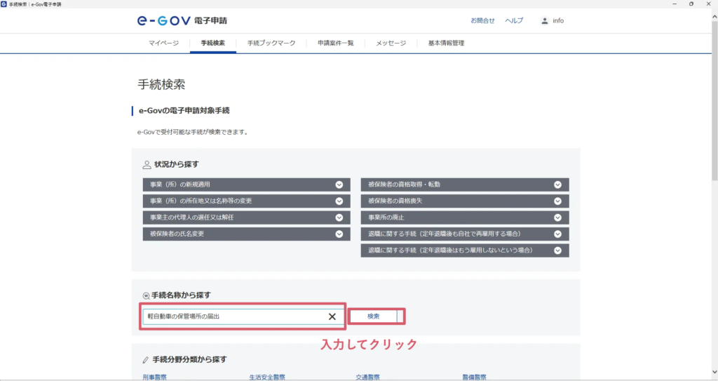 検索窓に「軽自動車の保管場所の届出」と入力し検索。