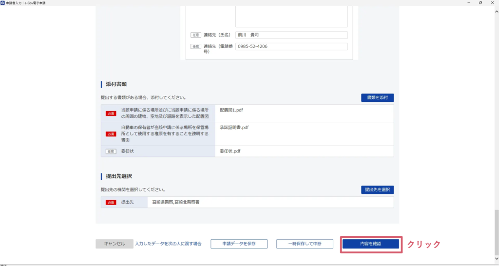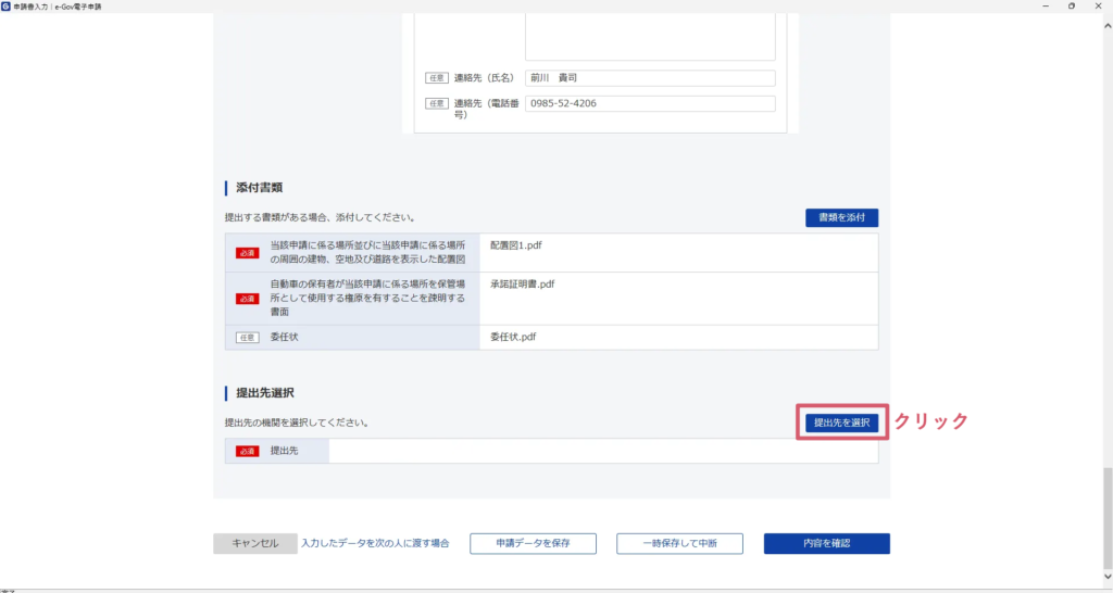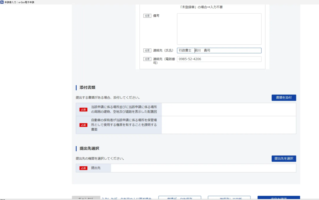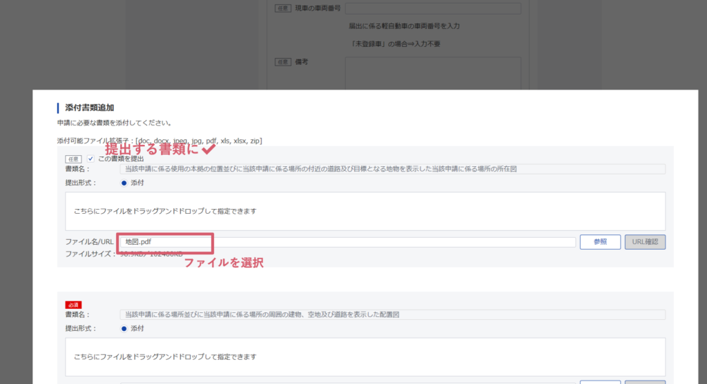 添付書類(配置図や保管場所の使用権原を示す書類など)をアップロードします。