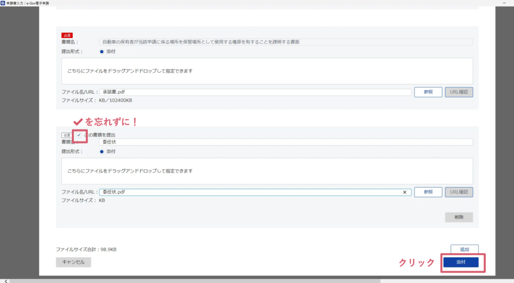 委任状ファイルなどを追加する場合は「追加」ボタンをクリックすると新たなフィールドが追加されます。