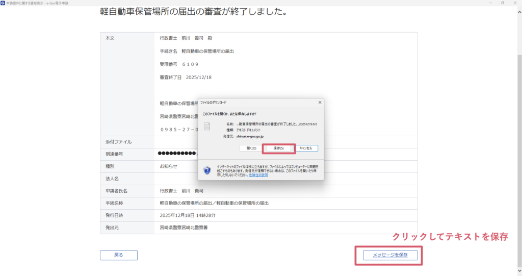 審査終了の通知を保存する場合は「メッセージを保存」をクリックしテキストファイルをダウンロードします。