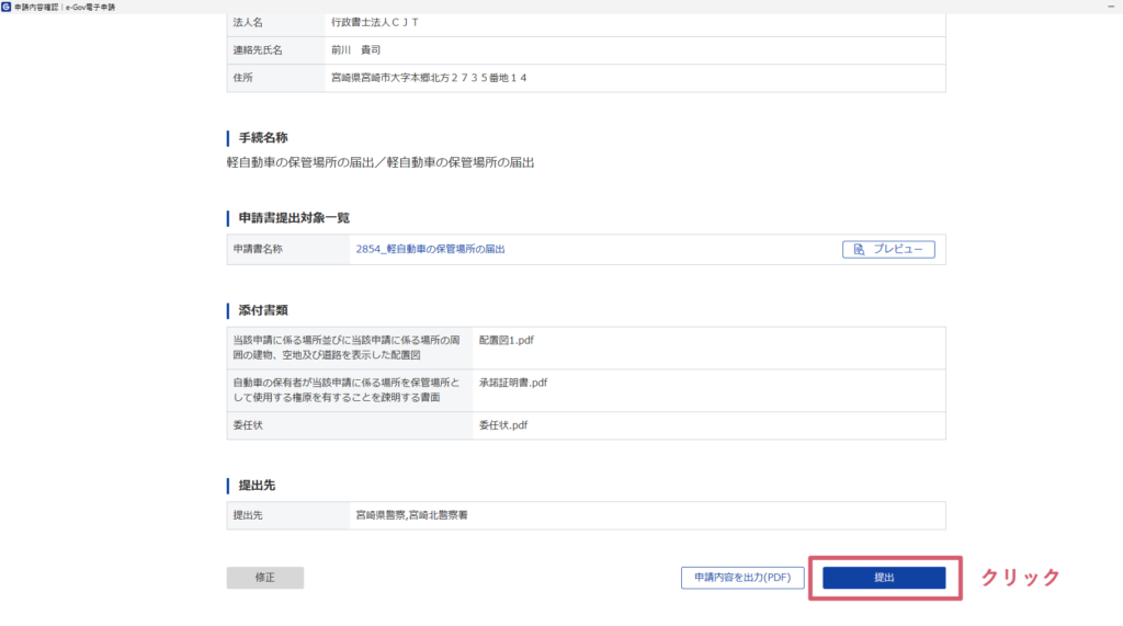 下にスクロールし申請内容を確認したうえで「提出」ボタンをクリックします。