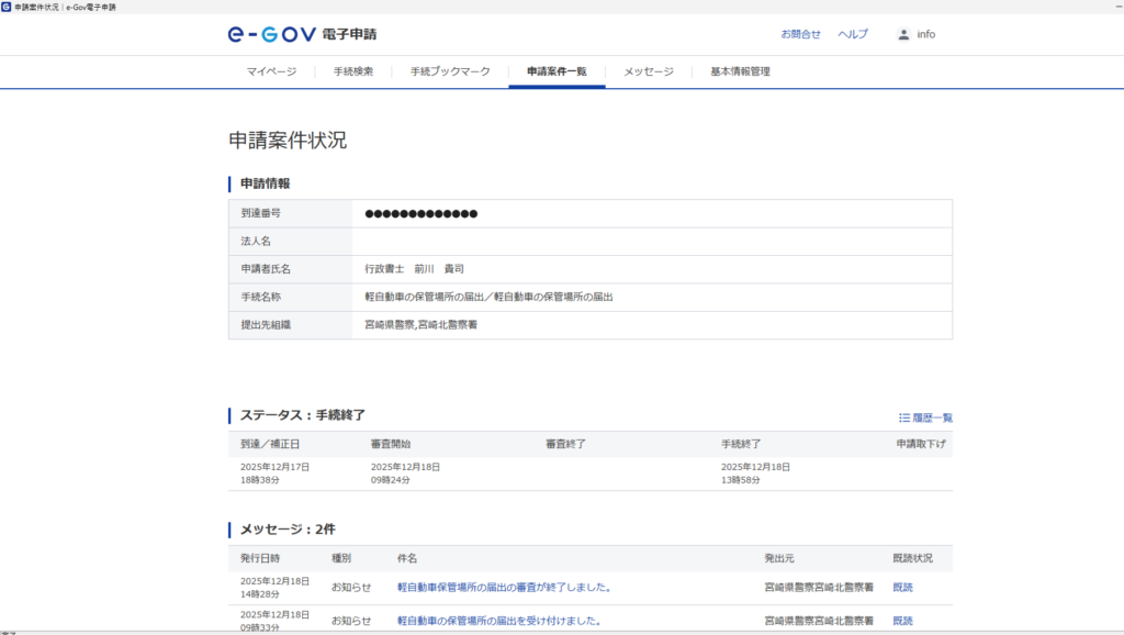 審査終了のメッセージを選択し、受理番号を確認して届出手続きは完了です。