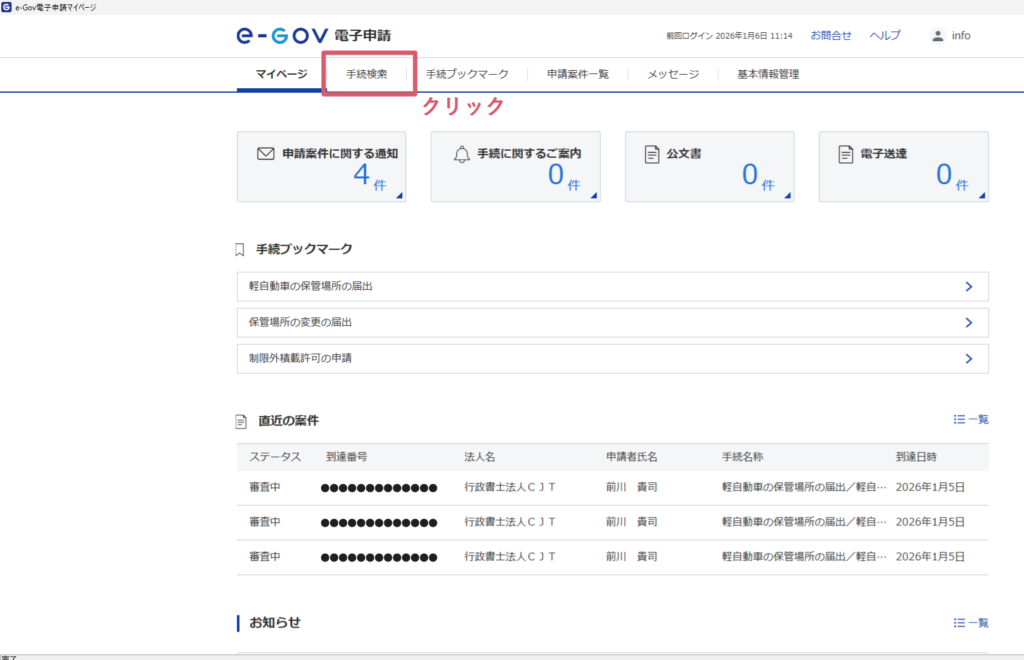 対象の申請の到達番号をクリックすると申請案件状況ページに遷移します。