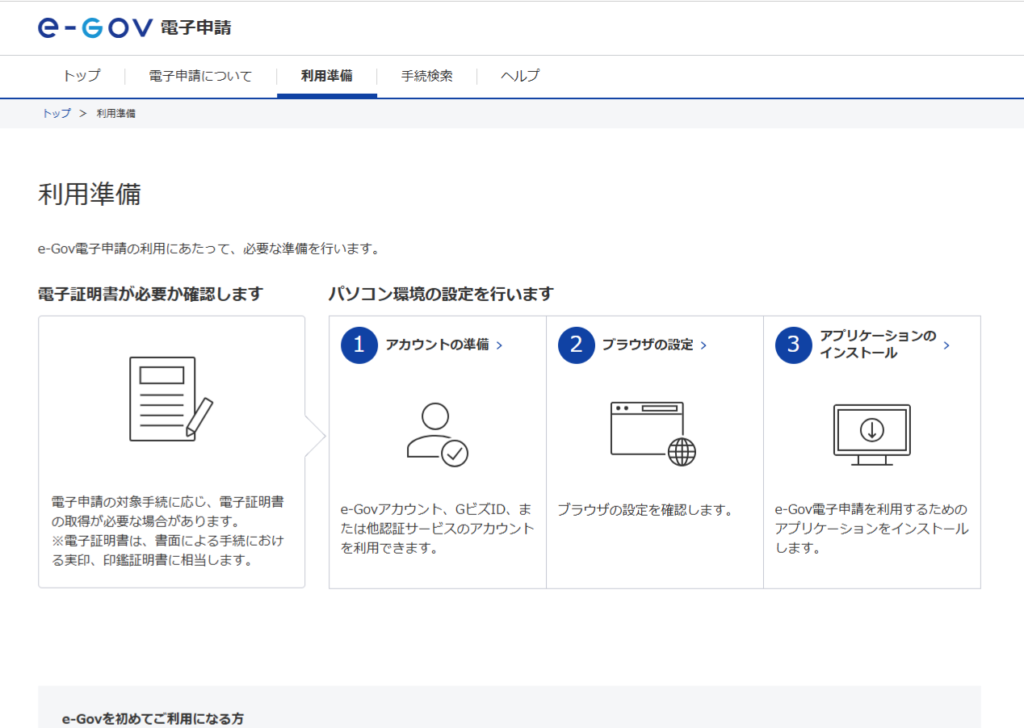 e-Govの各種サービスを利用するためには、まずアカウントの作成が必要です。