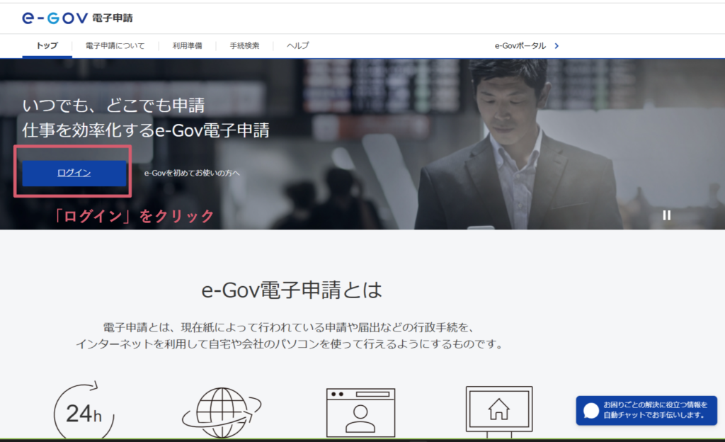 e-Govポータルサイトにアクセスしてからe-Gov電子申請のトップページを開きます。
